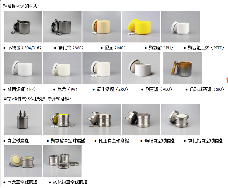 ● 氧化锆、玛瑙、碳化钨、不锈钢、尼龙、聚氨酯、聚四氟乙烯等十余种不同材质的球磨罐提供选择,研磨样品种类广泛;