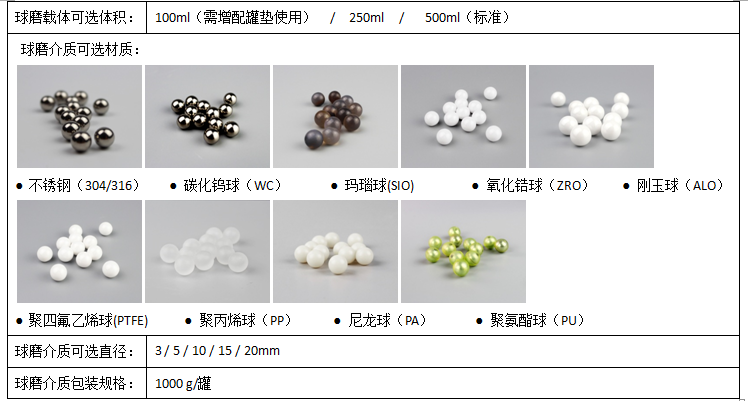 球磨介质材质: | 不锈钢、玛瑙、氧化锆、刚玉、尼龙、聚四氟乙烯、碳化钨等可选 |